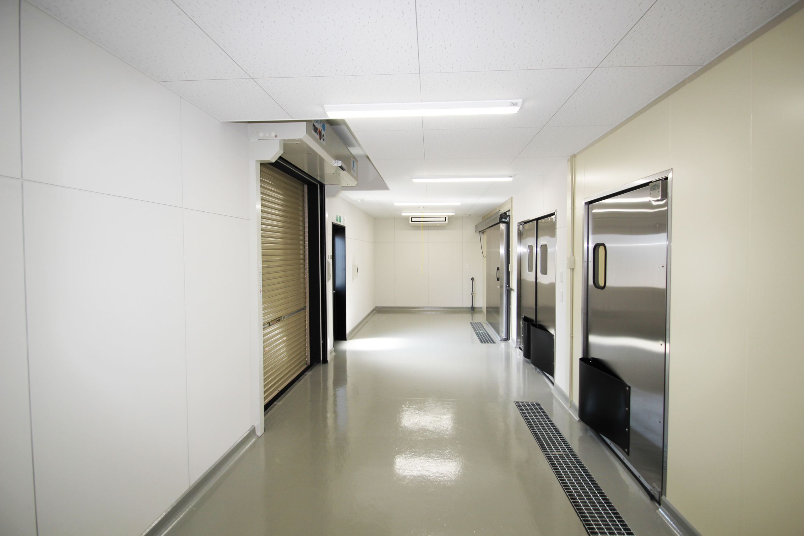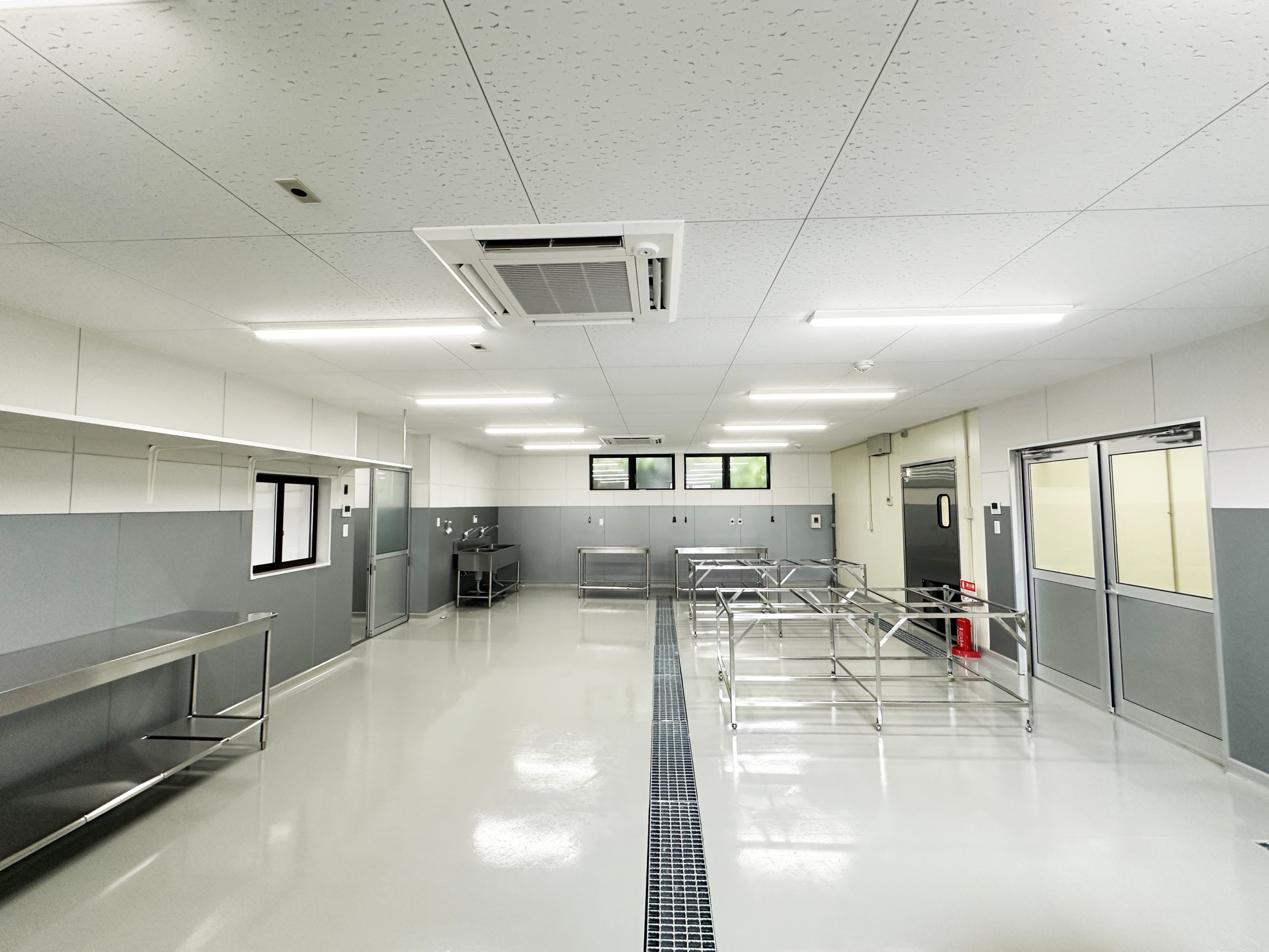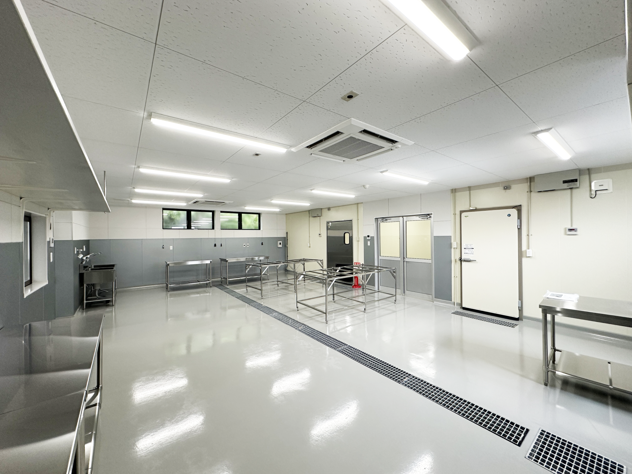 高岡市内で半世紀以上食肉卸業を営んでおられる法人様より、新しい加工場兼事務所の建築をご依頼いただきました。施主様や厨房機器メーカーのご担当者と打ち合わせを重ね、大きなプレハブ冷蔵庫や冷凍庫、その他の厨房機器のレイアウトを踏まえて設計を行い、作業がしやすい広々としたスペースを設けました。事務所部分は社長室や事務室、畳の小上がりのある休憩室や倉庫など、必要な広さをお伺いしながら設計を進めました。また、敷地への乗り入れ工事やアスファルト舗装工事などもご依頼いただきました。