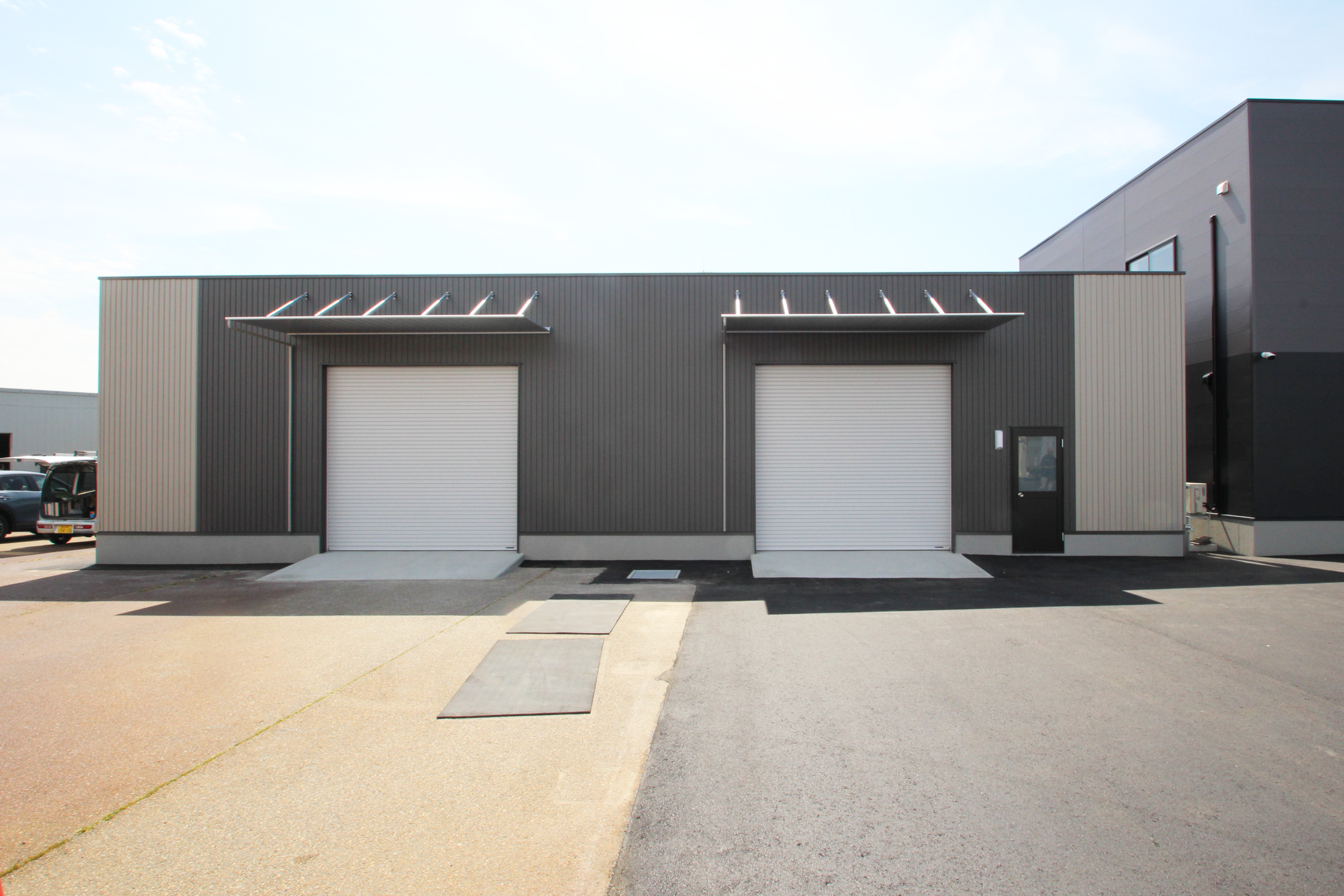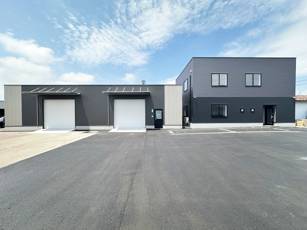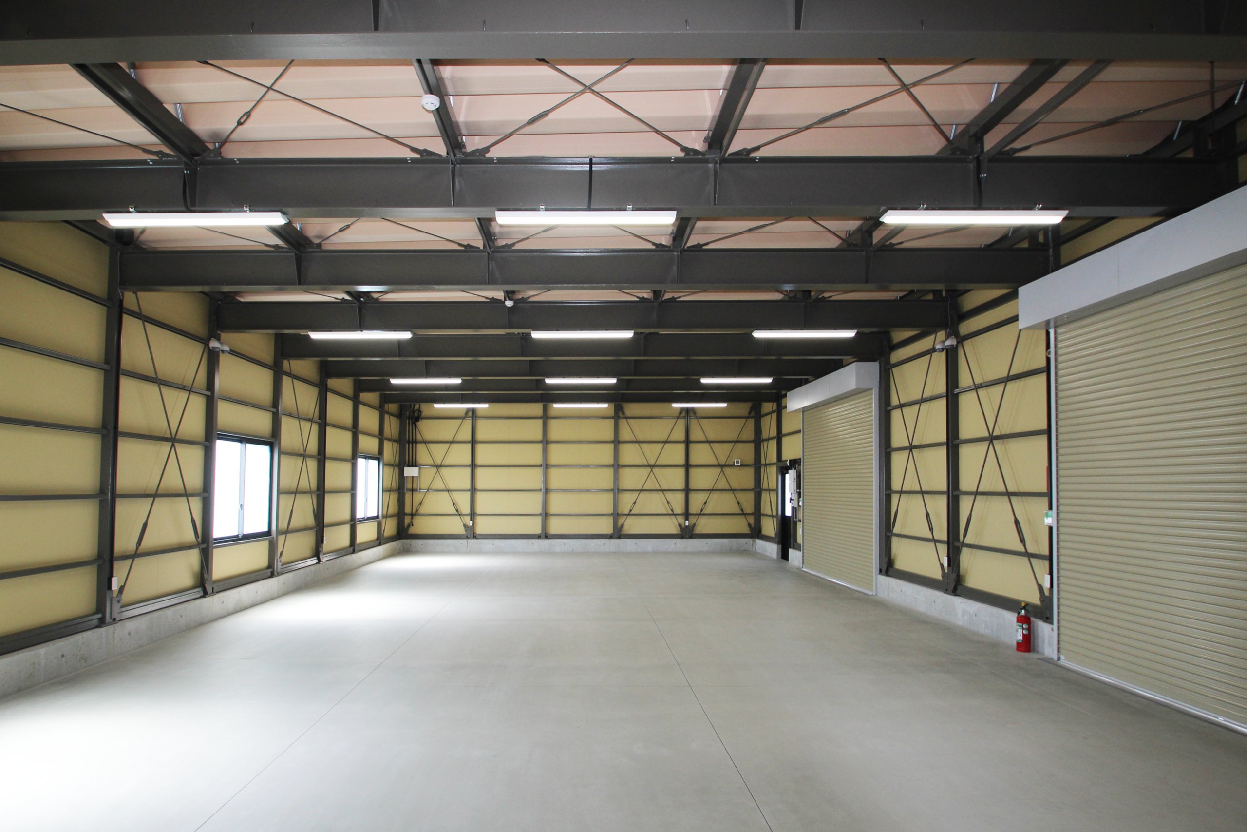 食品の運送業を営む法人様より倉庫の新築工事をご依頼いただきました。主にトラックのタイヤを保管する倉庫で、動線の確保がしやすくなるよう建物内部に柱が無く、タイヤの総耐荷重を考慮した設計を実施しました。また1500の出幅がある庇を設置してトラックの荷台を建物に近づけて荷下ろしができるようにしました。事務所の新築工事も同時にご依頼いただき、一体感のある建物に仕上げました。